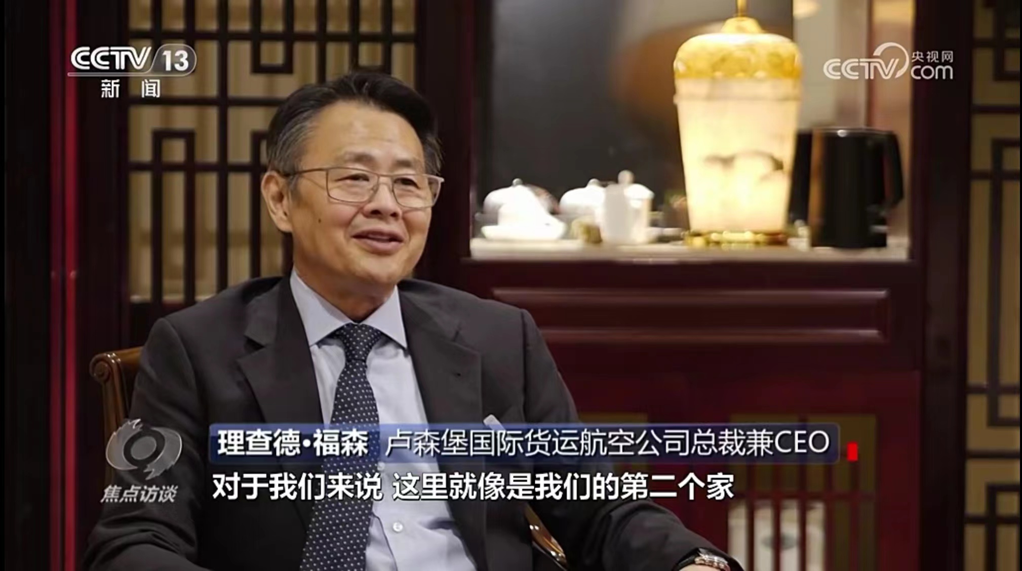 10月11日,央視《焦點訪談》播發系列報道“絲路同行”第一集——雙向奔赴的繁榮之路。報道中說,“一帶一路”倡議的提出,讓河南明確了突破區位限制、向藍天要效益的開放思路。通過采訪河南航投集團黨委書記、董事長張明超和盧森堡貨航董事會主席湯姆·維斯格伯、總裁兼CEO理查德·福森,報道回顧了鄭盧“空中絲綢之路”十年探索實踐和豫盧之間的友好情誼。節目評論道:“(河南航投與盧森堡貨航)之間早已超越了生意伙伴這一簡單的關系,多年的合作讓鄭州與盧森堡兩個航空樞紐之間的互聯互通真正實現了彼此雙方互利共贏和美美與共。這一切都在詮釋著‘一帶一路’倡議的核心要義。”