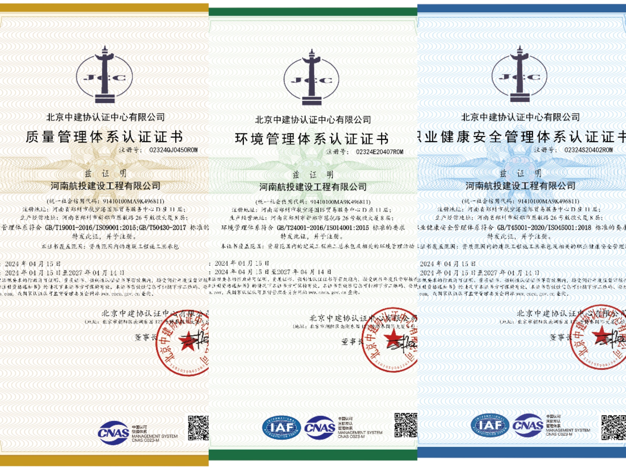 4月15日,河南航投建設工程有限公司(以下簡稱航投建工)通過ISO9001質量管理體系、ISO14001環(huán)境管理體系、ISO45001職業(yè)健康安全管理體系(以下簡稱ISO三體系)認證并獲得證書,這標志著航投建工的規(guī)范化標準化管理邁上新臺階,為持續(xù)提升市場競爭力、拓展合作新領域打下堅實基礎。