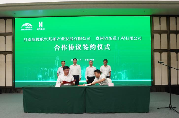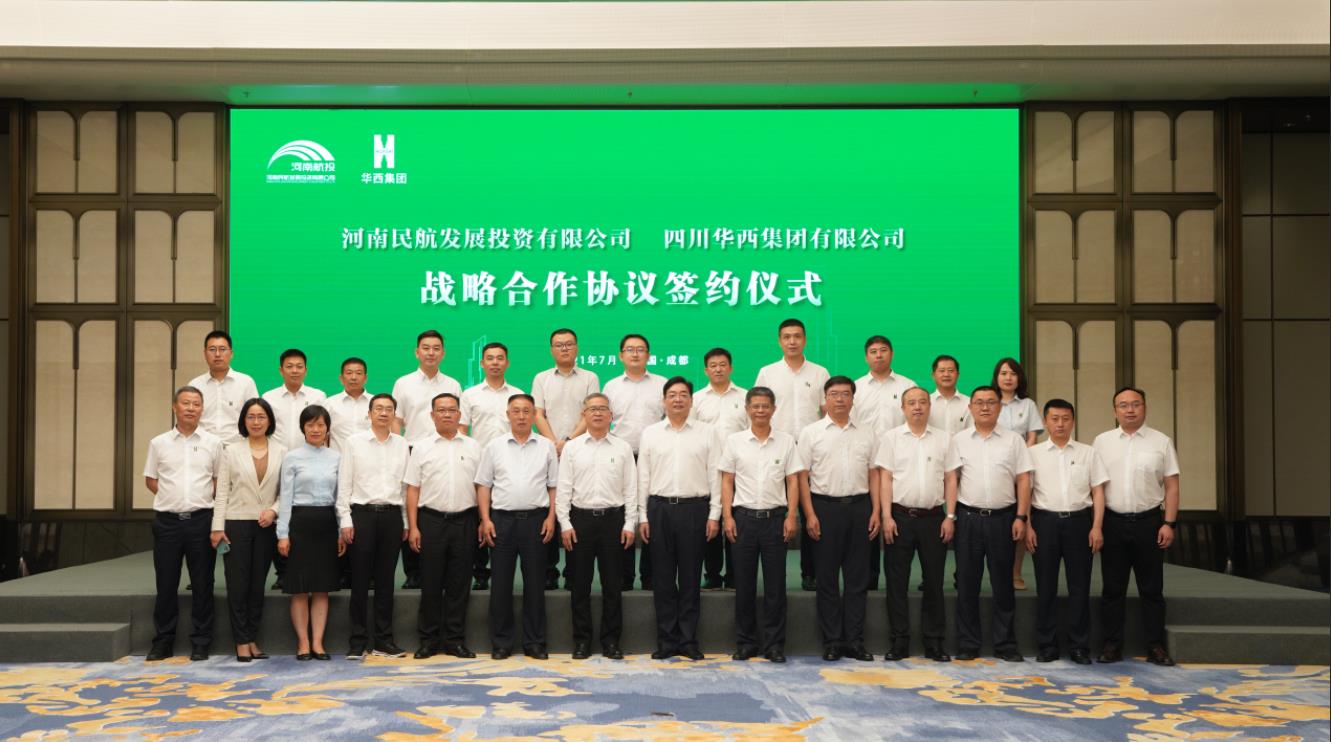 7月16日,河南民航發展投資有限公司(簡稱河南航投)與四川華西集團有限公司(簡稱四川華西)在成都舉行了簡短而熱烈的簽約儀式,兩家跨省國企約定,在民航產業展開全面合作。河南航投黨委書記、董事長張明超,黨委副書記、總經理、副董事長劉建葆,四川華西黨委書記、董事長楊斌,黨委副書記、總經理、副董事長馬林出席。張明超、楊斌分別致辭,劉建葆、馬林代表雙方簽訂《戰略合作協議》,河南航投基礎產業公司董事長趙楠和貴州場道公司執行董事劉國呈代表子公司簽訂《合資合作協議》。