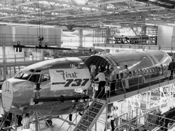 圖:1966年7月,首架737進(jìn)行機(jī)頭和機(jī)身的組裝。圖片來自《西雅圖時(shí)報(bào)》