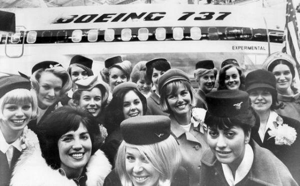 圖:1967年1月,17家已經(jīng)訂購了737飛機(jī)的航空公司空姐在第一架737飛機(jī)前合影。圖片來自美聯(lián)社