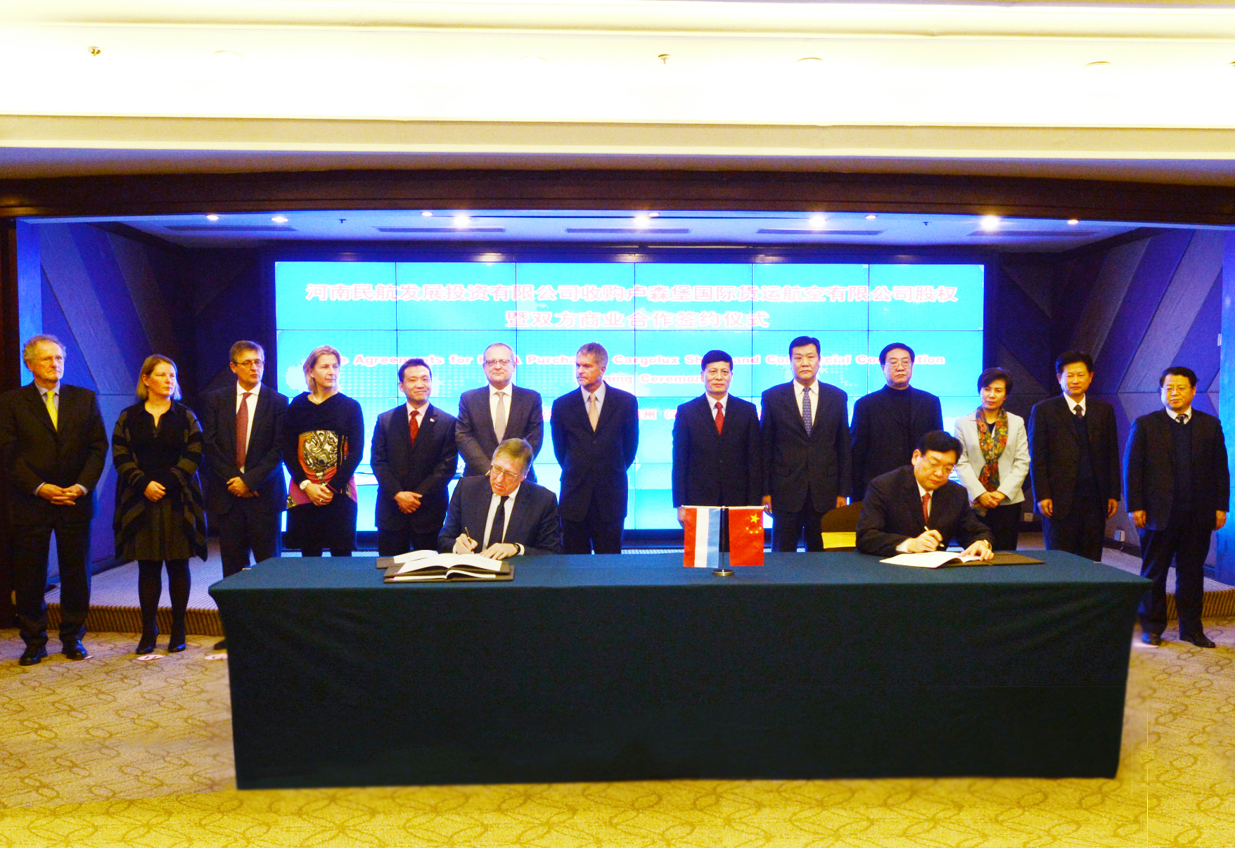1月14日下午,河南航空業(yè)又迎來一樁盛事:河南民航發(fā)展投資有限公司(以下簡稱河南航投)收購盧森堡國際貨運航空公司(以下簡稱盧貨航)股權(quán)暨雙方商業(yè)合作簽約儀式在鄭州舉行,河南航投董事長、黨委書記張明超分別與盧森堡可持續(xù)發(fā)展與基礎(chǔ)產(chǎn)業(yè)部部長弗朗索瓦?鮑施、盧貨航董事會主席保羅?海明格簽署了相關(guān)協(xié)議。這標志著國際一流的全貨運航空公司正式落戶鄭州航空港經(jīng)濟綜合實驗區(qū),該合作架起了一條橫貫中歐的貨運“空中絲綢之路”,為河南省對外開放增添了新高地。河南省省長謝伏瞻在簽約前會見盧森堡代表團并見簽。盧森堡駐上??傤I(lǐng)事呂可為、河南省副省長趙建才,省長助理、省民航辦主任安惠元,河南航投總經(jīng)理、副董事長、黨委副書記劉建葆一同參加了儀式。
